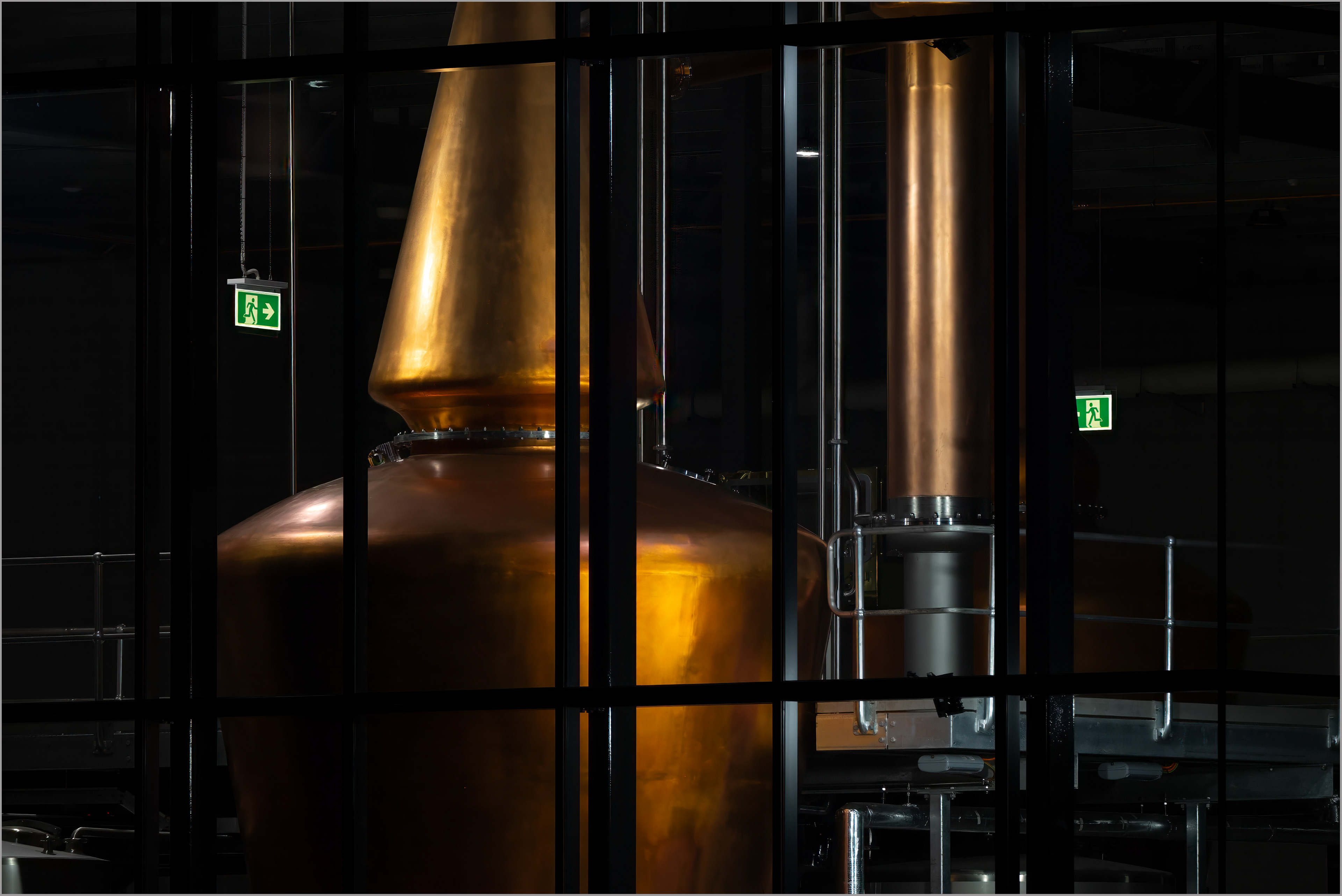 An ugly, industrial building, in a rural setting, has actually revealed an interesting aesthetic when viewed at nighttime. I had seen this view in passing by and decided to record it at a later date with a long lens, from the roadside. It was a cold night and some of the amber fluid being distilled, would have been welcome. Unfortunately the glowing copper will soon tarnish and the warmth of the view will be lost.