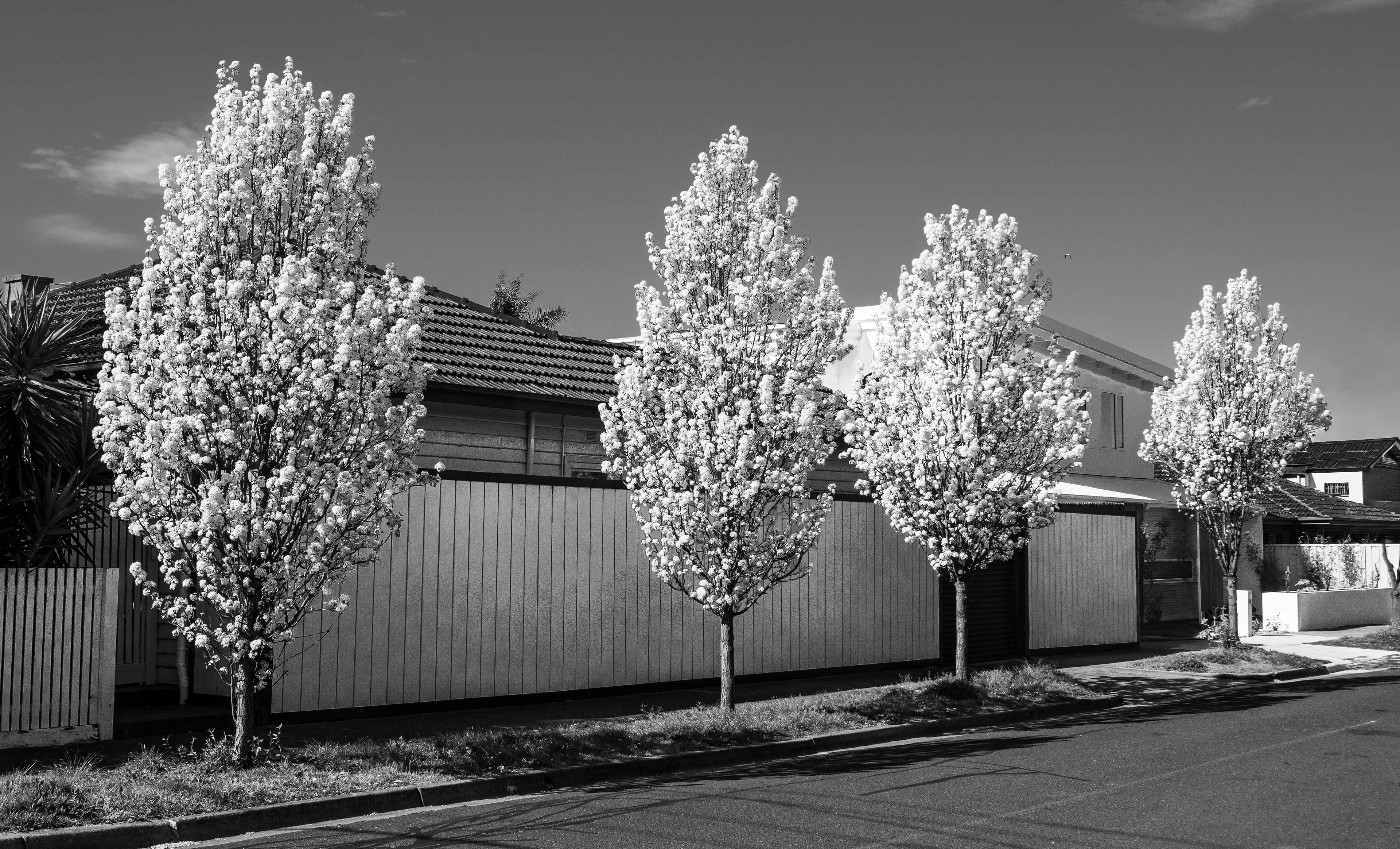 This scene made me stop and look. It was a blue-sky day in Melbourne and these displays of blossom were really striking, however, there was too much colour. The monochrome conversion emphasises the blossom whilst the white fence and building complement the subject of the image.